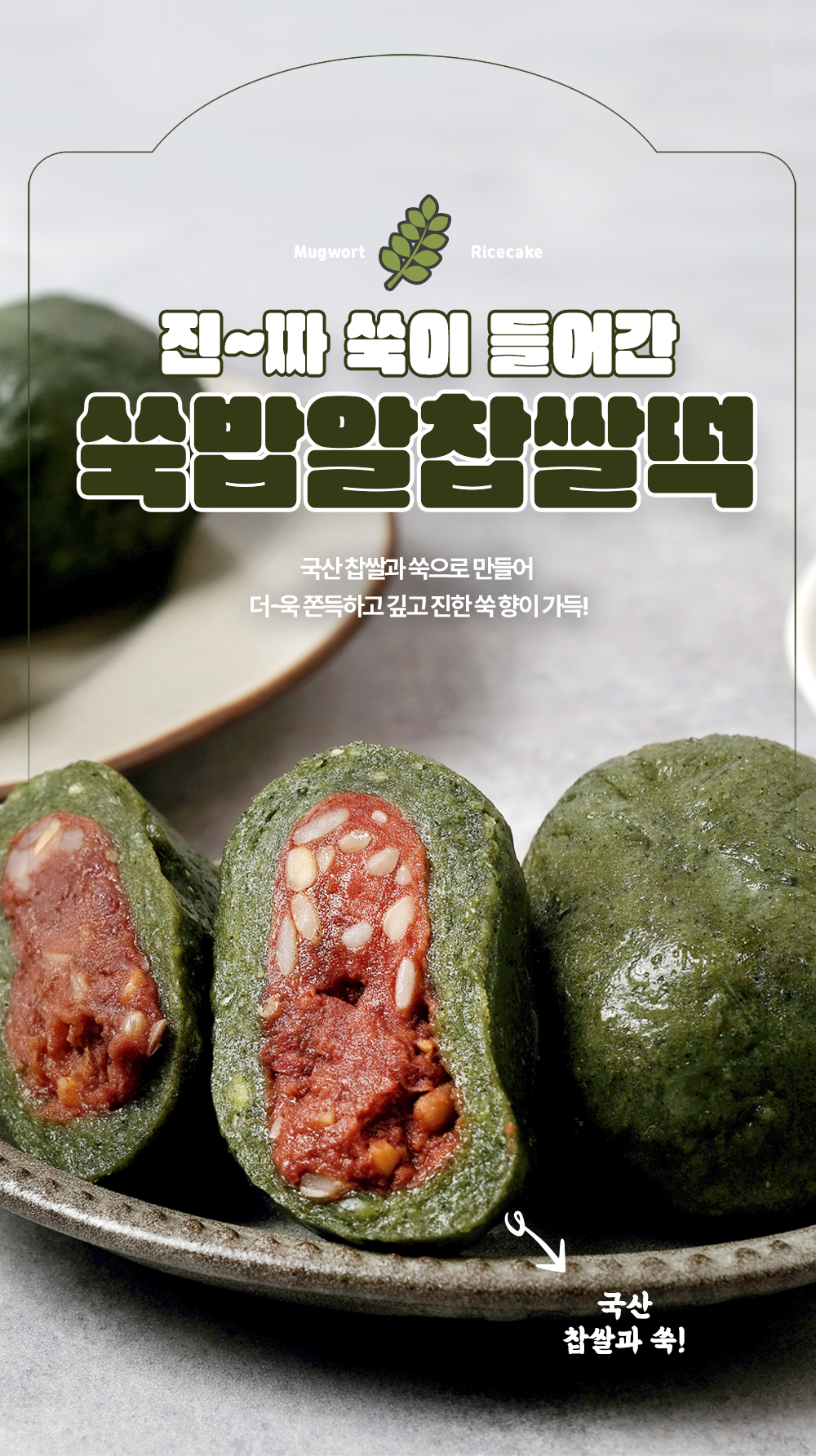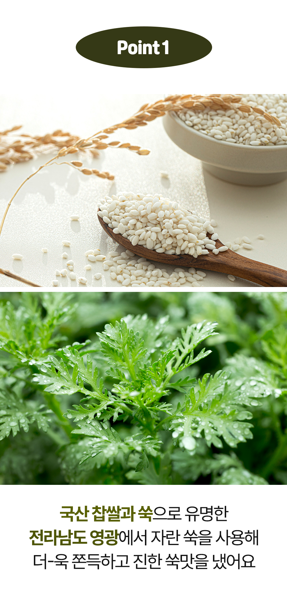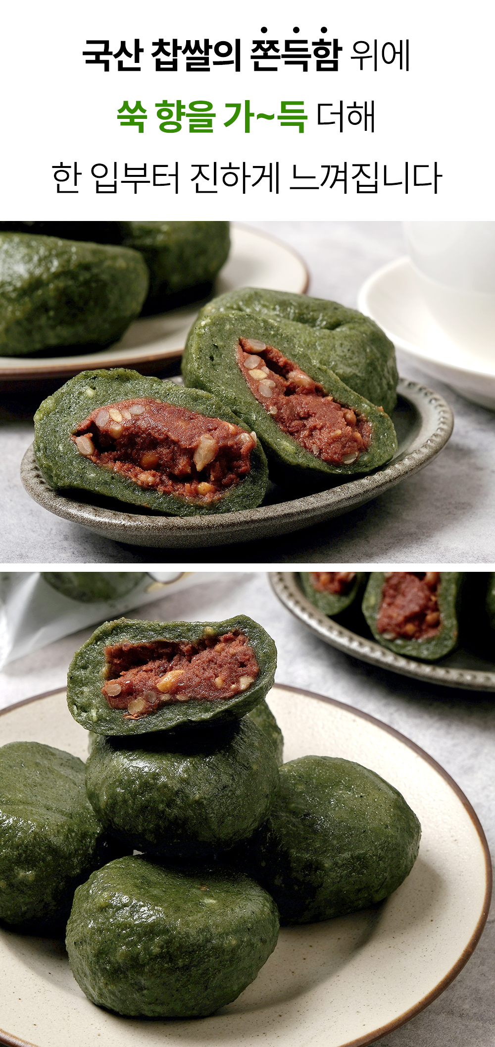 100% 국산 찹쌀과 쑥으로 만들어 더-욱 쫀득! 깊고 진한 쑥 향도 가득!