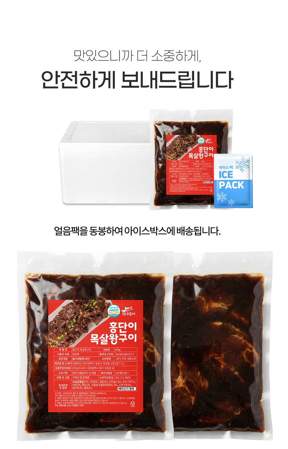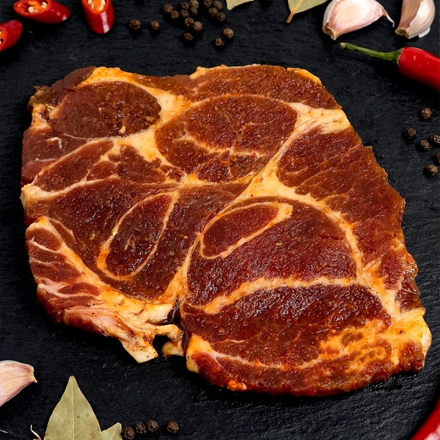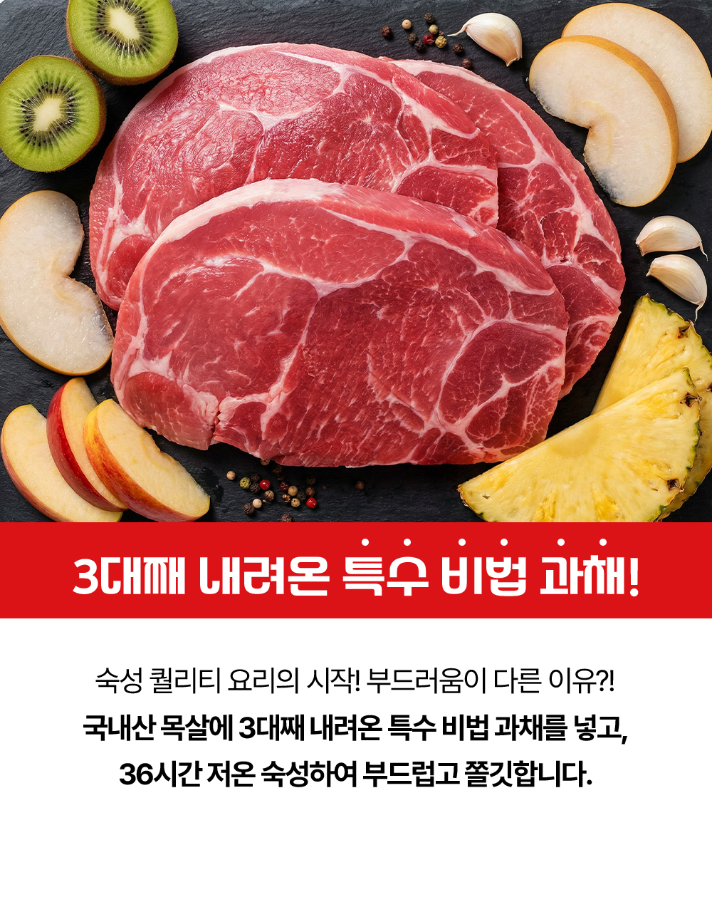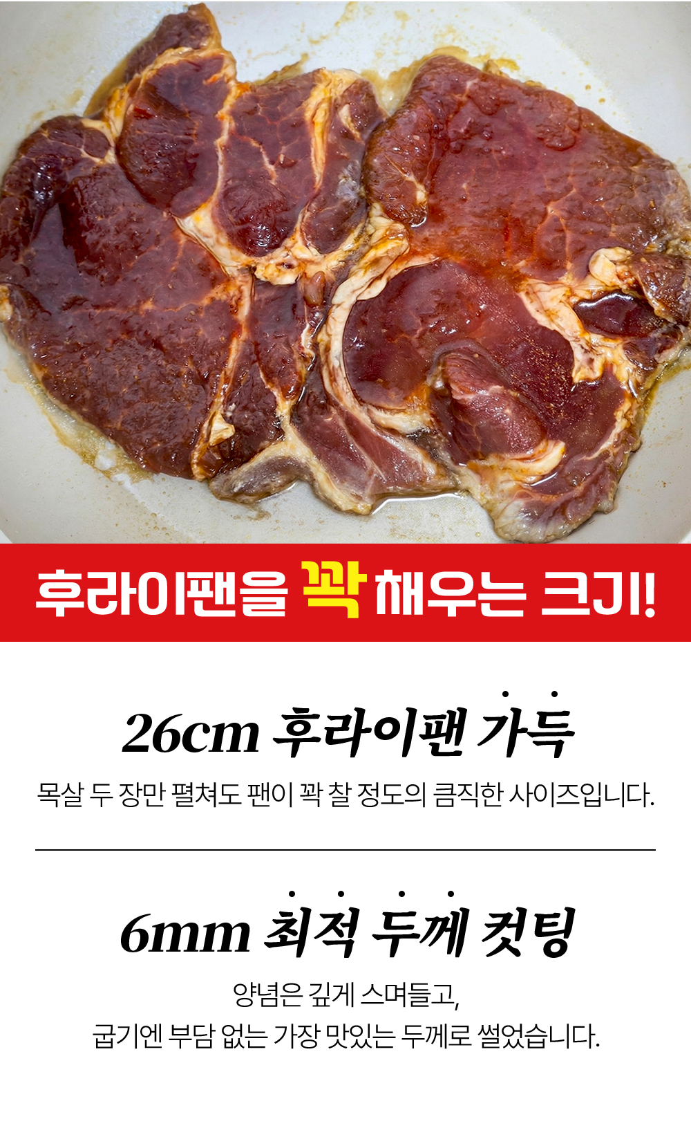 간장의 깊은 맛에 매콤한 양념을 살짝 더한 특제 붉은 간장 양념 목살왕구이! 600g 구성으로 넉넉하게 즐겨보세요
