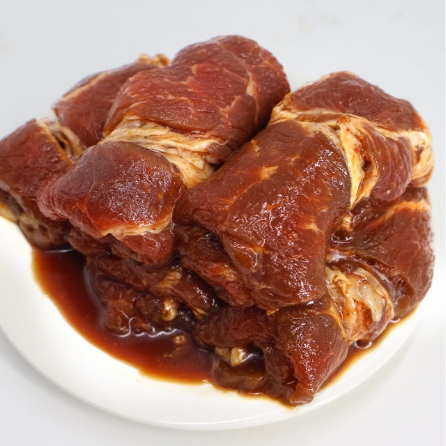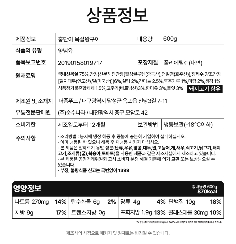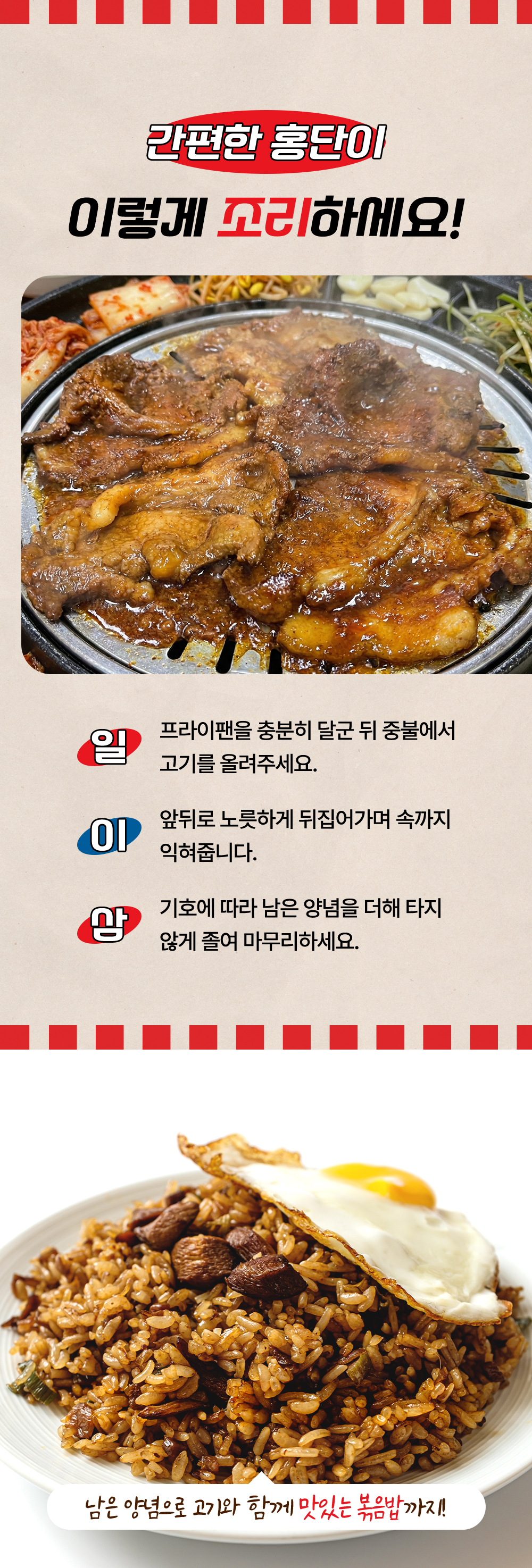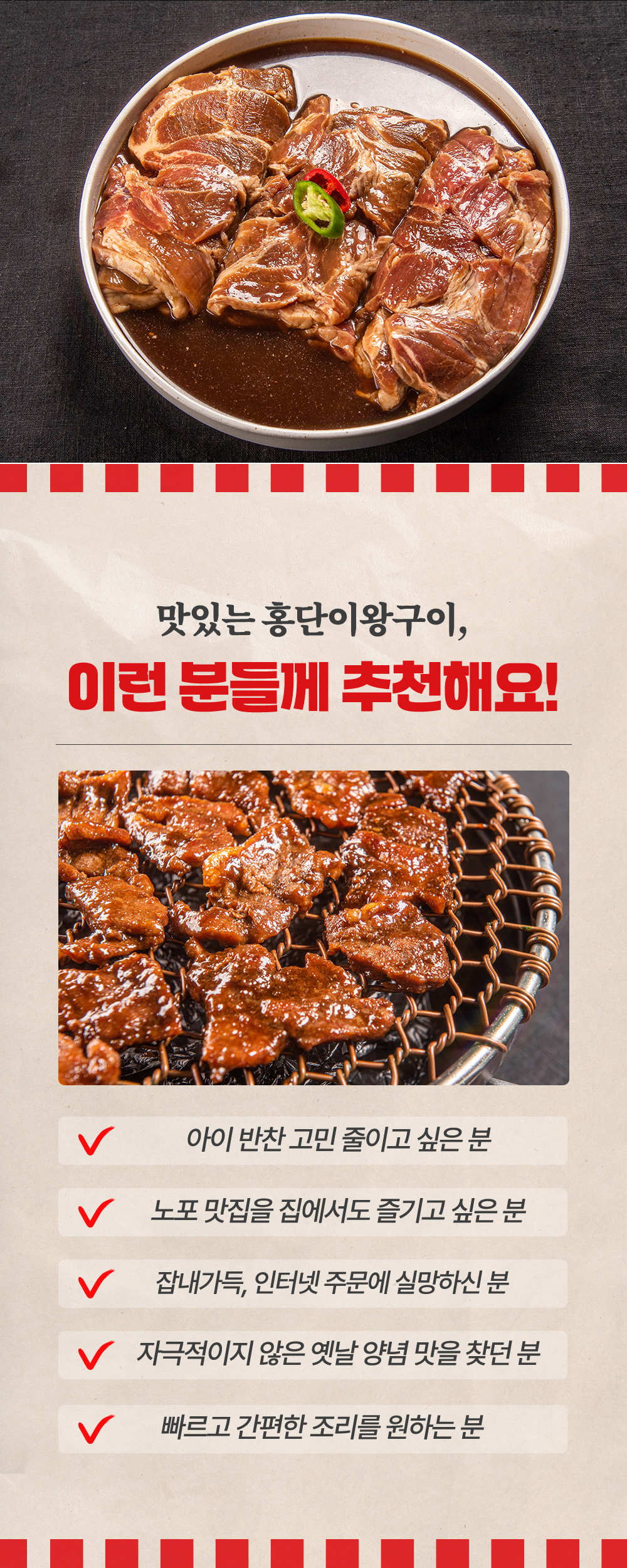 간장의 깊은 맛에 매콤한 양념을 살짝 더한 특제 붉은 간장 양념 목살왕구이! 600g 구성으로 넉넉하게 즐겨보세요