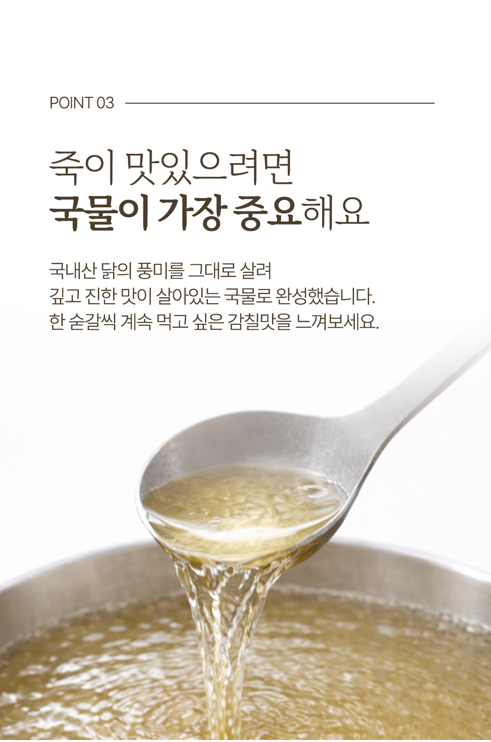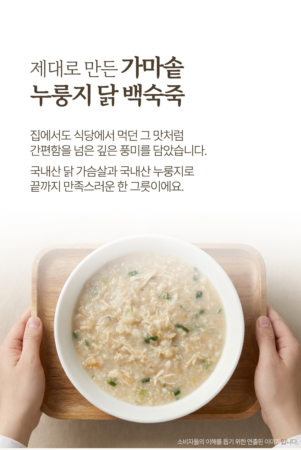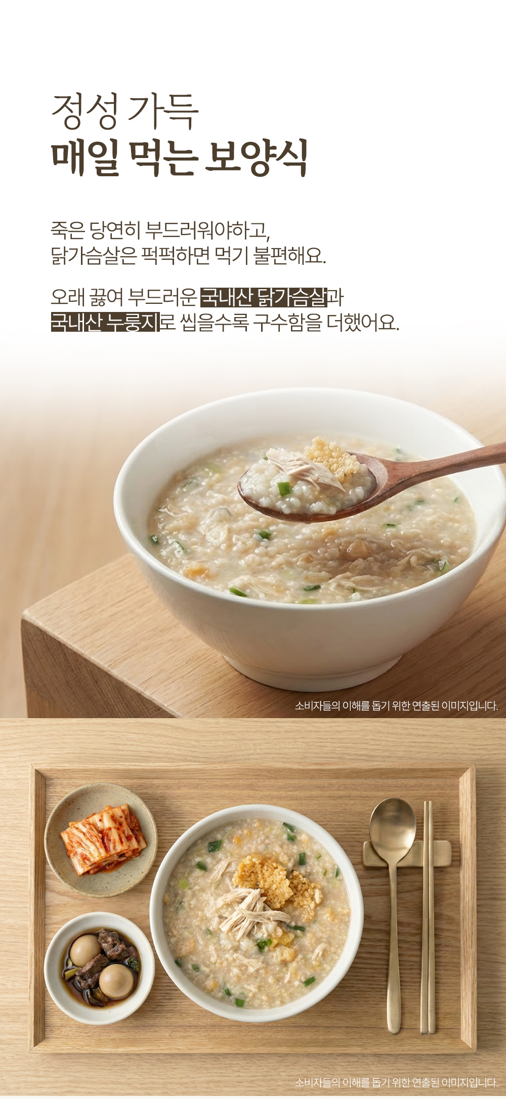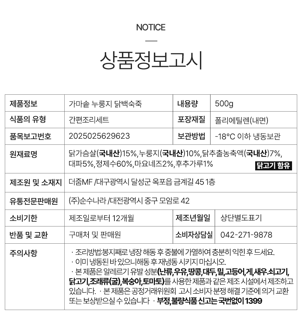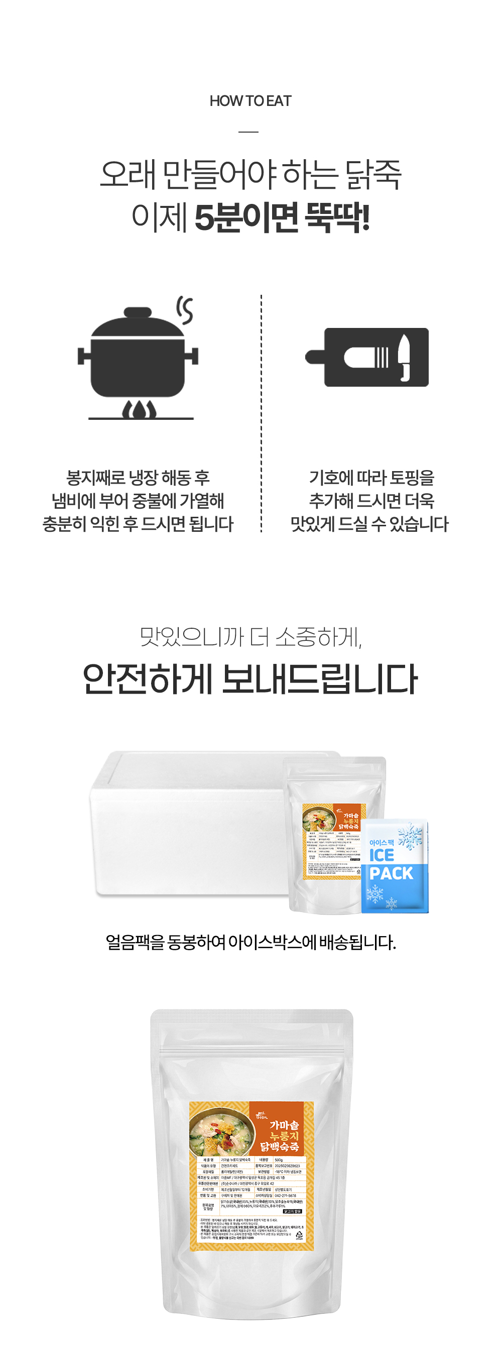 집에서도 식당에서 먹던 그 맛처럼! 국내산 닭가슴살과 국내산 누룽지로 씹을수록 구수함 가득! 정성도 가득한 보양식입니다.
