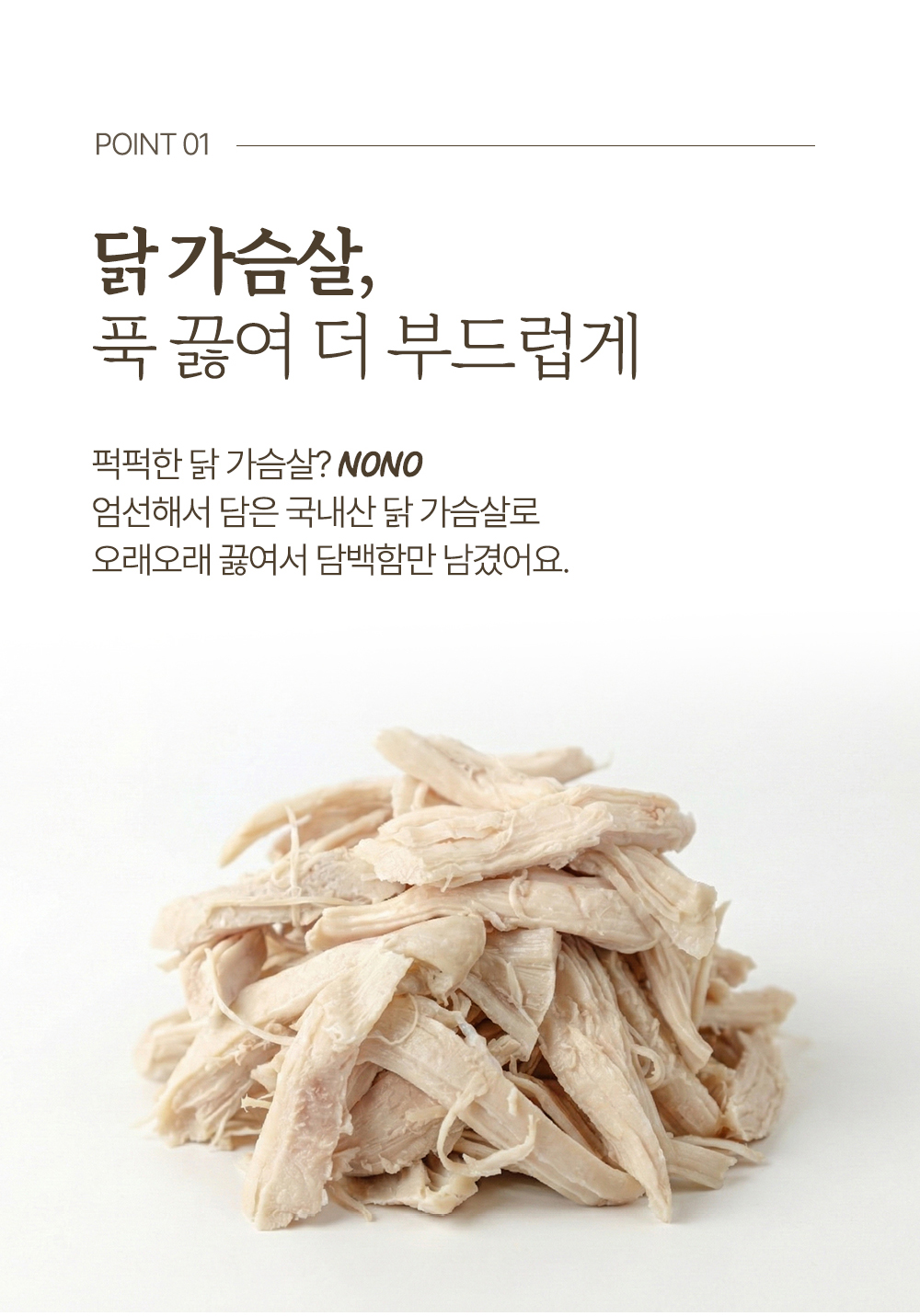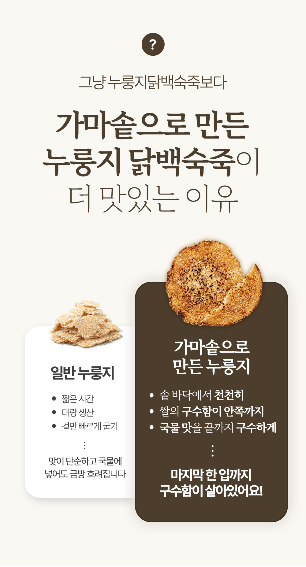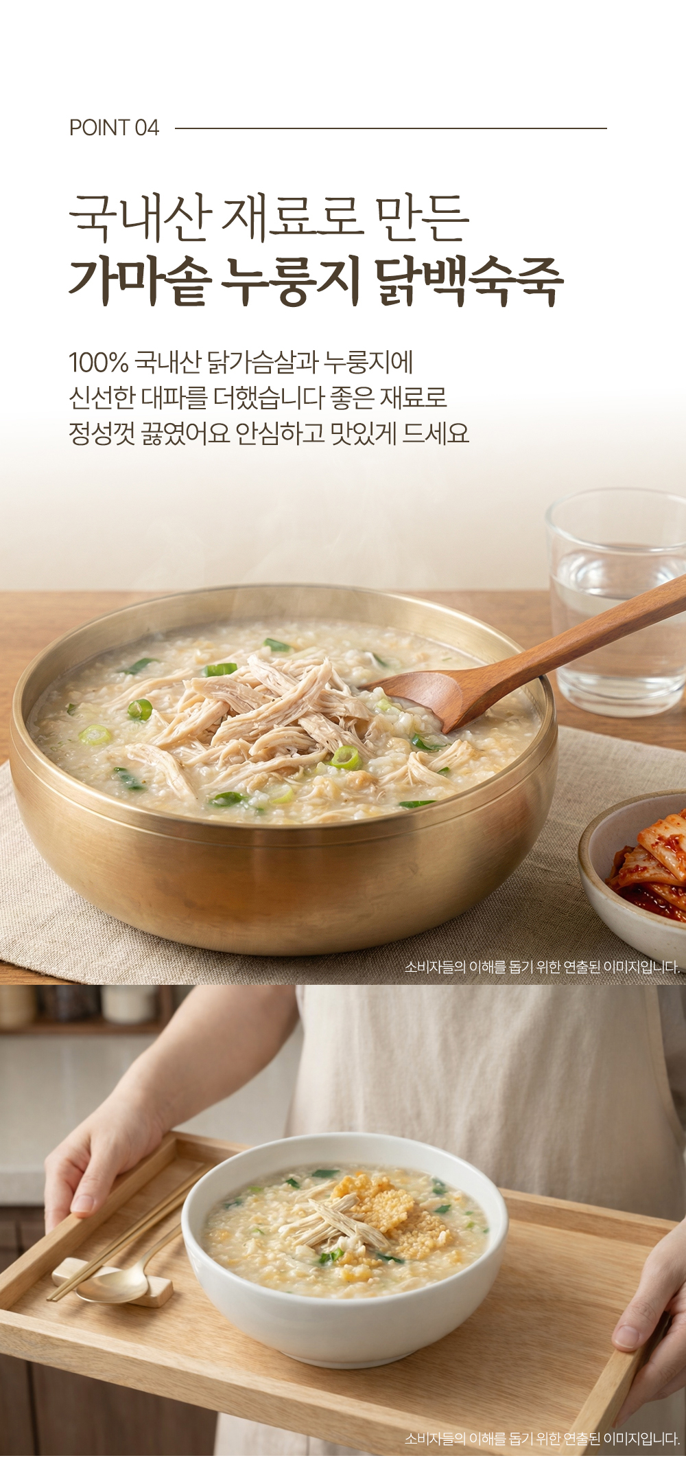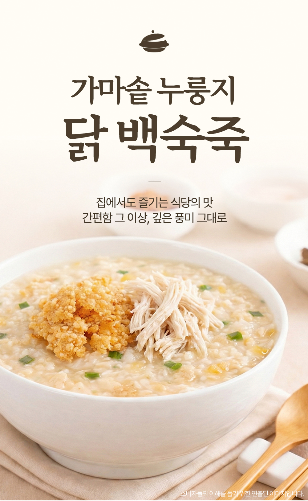 집에서도 식당에서 먹던 그 맛처럼! 국내산 닭가슴살과 국내산 누룽지로 씹을수록 구수함 가득! 정성도 가득한 보양식입니다.